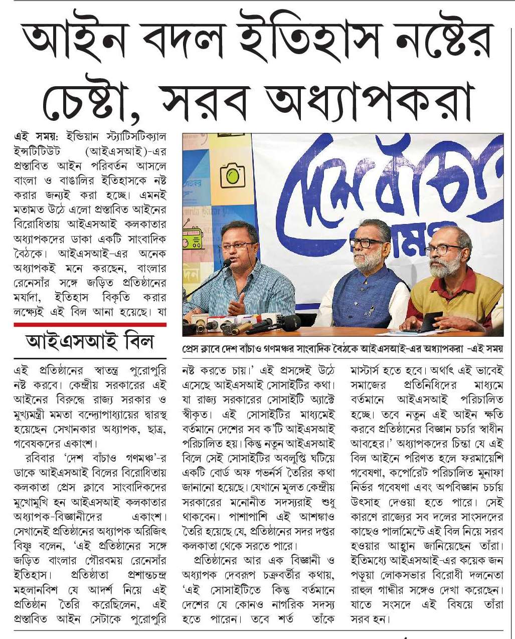 প্রেস ক্লাবে দেশ বাঁচাও গণমঞ্চর সাংবাদিক বৈঠকে আইএসআই-এর অধ্যাপকরা-এই সময় আইন বদল ইতিহাস নষ্টের চেষ্টা, সরব অধ্যাপকরা এই সময়: ইন্ডিয়ান স্ট্যাটিসটিক্যাল ইন্সটিটিউট (আইএসআই)-এর~~~� ইতিহাস। প্রতিষ্ঠাতা প্রশান্তচন্দ্র মহলানবিশ যে আদর্শ নিয়ে এই প্রতিষ্ঠান তৈরি করেছিলেন, এই প্রস্তাবিত আইন সেটাকে পুরোপুরি নষ্ট করতে চায়।' এই প্রসঙ্গেই উঠে এসেছে আইএসআই সোসাইটির কথা। যা রাজ্য সরকারের সোসাইটি অ্যাক্টে স্বীকৃত। এই সোসাইটির মাধ্যমেই বর্তমানে দেশের সব ক'টি আইএসআই পরিচালিত হয়। কিন্তু নতুন আইএসআই বিলে সেই সোসাইটির অবলুপ্তি ঘটিয়ে একটি বোর্ড অফ গভর্নর্স তৈরির কথা জানানো হয়েছে। যেখানে মূলত কেন্দ্রীয় সরকারের মনোনীত সদস্যরাই শুধু থাকবেন। পাশাপাশি এই আশঙ্কাও তৈরি হয়েছে যে, প্রতিষ্ঠানের সদর দপ্তর কলকাতা থেকে সরতে পারে। প্রতিষ্ঠানের আর এক বিজ্ঞানী ও অধ্যাপক দেবরূপ চক্রবর্তীর কথায়, 'এই সোসাইটিতে কিন্তু বর্তমানে দেশের যে কোনও নাগরিক সদস্য হতে পারেন। তবে শর্ত তাঁকে মাস্টার্স হতে হবে। অর্থাৎ এই ভাবেই সমাজের প্রতিনিধিদের মাধ্যমে বর্তমানে আইএসআই পরিচালিত হচ্ছে। তবে নতুন এই আইন ক্ষতি করবে প্রতিষ্ঠানের বিজ্ঞান চর্চার স্বাধীন আবহের।' অধ্যাপকদের চিন্তা যে এই বিল আইনে পরিণত হলে ফরমায়েশি গবেষণা, কর্পোরেট পরিচালিত মুনাফা নির্ভর গবেষণা এবং অপবিজ্ঞান চর্চায় উৎসাহ দেওয়া হতে পারে। সেই কারণে রাজ্যের সব দলের সাংসদদের কাছেও পার্লামেন্টে এই বিল নিয়ে সরব হওয়ার আহ্বান জানিয়েছেন তাঁরা। ইতিমধ্যে আইএসআই-এর কয়েক জন পড়ুয়া লোকসভার বিরোধী দলনেতা রাহুল গান্ধীর সঙ্গেও দেখা করেছেন। যাতে সংসদে এই বিষয়ে তাঁরা সরব হন। আইএসআই বিল~~~ে বর্তমানে আইএসআই পরিচালিত হচ্ছে। তবে নতুন এই আইন ক্ষতি করবে প্রতিষ্ঠানের বিজ্ঞান চর্চার স্বাধীন আবহের।' অধ্যাপকদের চিন্তা যে এই বিল আইনে পরিণত হলে ফরমায়েশি গবেষণা, কর্পোরেট পরিচালিত মুনাফা নির্ভর গবেষণা এবং অপবিজ্ঞান চর্চায় উৎসাহ দেওয়া হতে পারে। সেই কারণে রাজ্যের সব দলের সাংসদদের কাছেও পার্লামেন্টে এই বিল নিয়ে সরব হওয়ার আহ্বান জানিয়েছেন তাঁরা। ইতিমধ্যে আইএসআই-এর কয়েক জন পড়ুয়া লোকসভার বিরোধী দলনেতা রাহুল গান্ধীর সঙ্গেও দেখা করেছেন। যাতে সংসদে এই বিষয়ে তাঁরা সরব হন। আইএসআই বিল